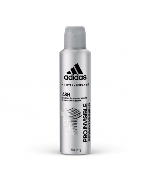 Para oferecer uma performance sem manchas, o desodorante aerossol Adidas Pro Invisible tem fórmula exclusiva desenvolvida com atletas, ação antibacteriana e sistema antimanchas brancas e amarelas, mantendo você seco e protegido por até 48 horas. Dermatologicamente testado, o desodorante aerossol Adidas Pro Invisible possui 0% de álcool, respeitando pH da pele.