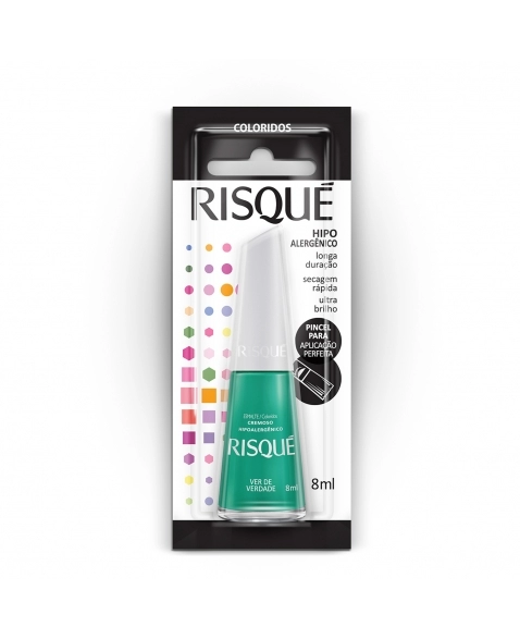 Veja a beleza em todo o lugar com o Esmalte Risqué Colorido Cremoso Ver De Verdade. Toda a linha de esmaltes Risqué Coloridos Cremosos, além de apresentar textura única e cores vivas, acompanha as tendências da moda, possibilitando diversas composições de looks e maximizando a beleza da sua maquiagem e acessórios. Com secagem rápida, use a sua imaginação e crie lindas nails art que farão sucesso aonde quer que você vá. Com fórmula especial, livre de componentes que costumam causar alergias, o Esmalte Risqué é perfeito para os cuidados diários. Apaixone-se pela cor, presencie a longa duração e viva a beleza de suas unhas de forma única com o Esmalte Risqué Colorido Cremoso Ver De Verdade.