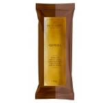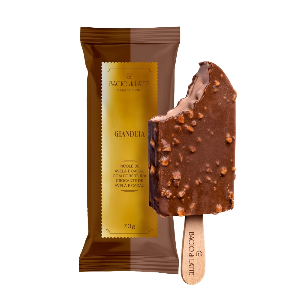Gelato de chocolate com avelã, coberto por uma casquinha de chocolate com pedaços de avelã.