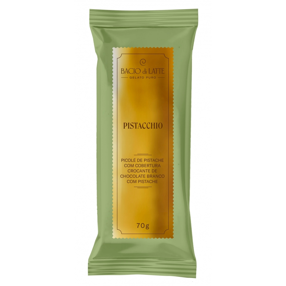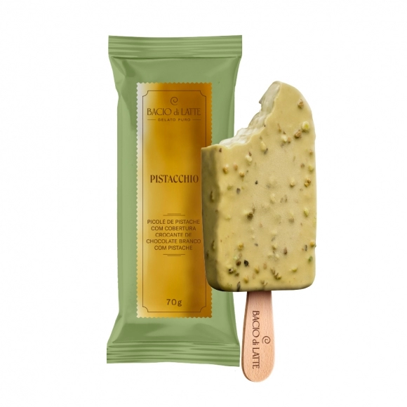 Gelato cremoso de pistache com cobertura crocante de chocolate branco com pistaches.