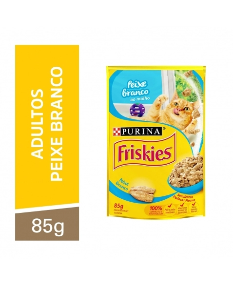 A Ração Úmida Friskies são deliciosos pedaços macios com peixe branco em um molho delicioso que os gatos adoram!